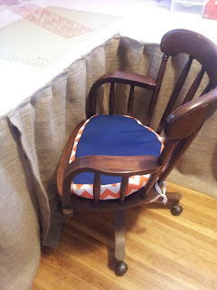 Seriously, look at those floors. Zach is amazing - he did every single plank of them through the whole house, by himself. I'm a blessed lady! Also, the chair. How cool is that? It's a vintage office chair (maybe from a courthouse?) that my mom gifted me for my birthday. I sewed a chair cushion to match the navy blue and orange theme, and attached it with ribbon.